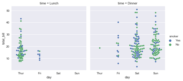 sns.factorplot(x="day", y="total_bill", hue="smoker", col="time", data=tips, kind="swarm");