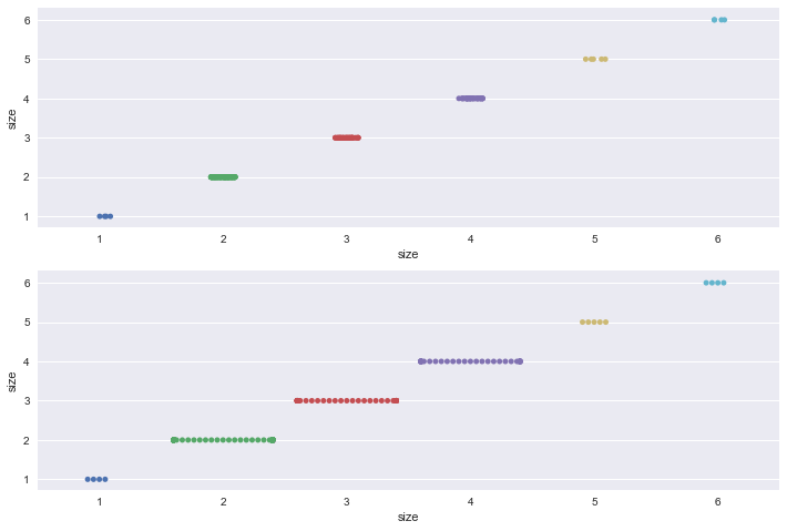 sns.stripplot(x='size',y='size',data=tips,jitter=True,ax=ax1) sns.swarmplot(x='size',y='size',data=tips,ax=ax2) plt.show()