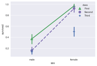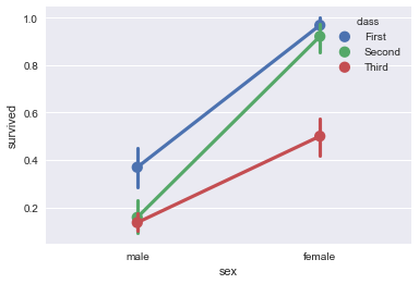 pointplot()函数提供了可视化相同信息的另一种风格。该函数还对另一轴的高度估计值进行编码,而不是显示一个完整的柱型,它只绘制点估计和置信区间。另外,这个函数和Barplot很相似,y特征都是计算对应的概率,不同的是该函数更加丰富,它还会对相同的hue特征进行连接,得到特征的变化曲线.