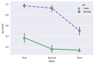 sns.pointplot(x="class", y="survived", hue="sex", data=titanic, palette={"male": "g", "female": "m"}, markers=["^", "o"], linestyles=["-", "--"]);