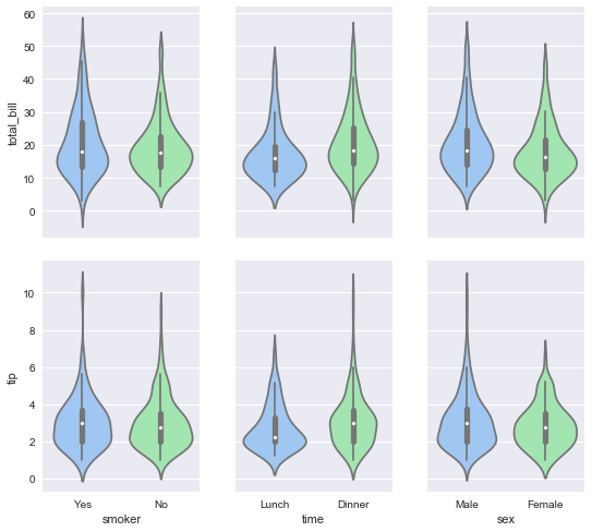 g = sns.PairGrid(tips, x_vars=["smoker", "time", "sex"], y_vars=["total_bill", "tip"], aspect=.75, size=3.5) g.map(sns.violinplot, palette="pastel");