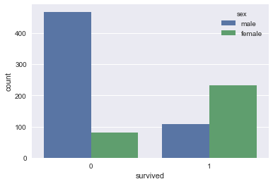 sns.countplot(hue='sex',x='survived',data=titanic)
