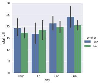 如果我们希望barplot的形式的话,将kind设置为bar即可.为了对比,此处我们也绘制barplot的形式,是不是发现和barplot一样的结果.