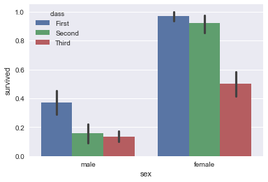 sns.barplot(x='sex',y='survived',hue='class',data=titanic)