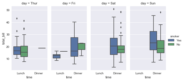 sns.factorplot(x="time", y="total_bill", hue="smoker", col="day", data=tips, kind="box", size=4, aspect=.5);