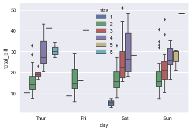 sns.boxplot(x="day", y="total_bill", hue="size", data=tips);