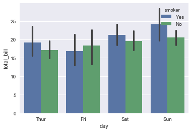 还可以传入hue参数添加多个嵌套的分类变量。高于分类轴上的颜色和位置时冗余的,现在每个都提供有两个变量之一的信息:
