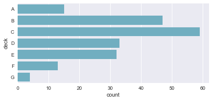 f, ax = plt.subplots(figsize=(7, 3)) sns.countplot(y="deck", data=titanic, color="c");