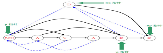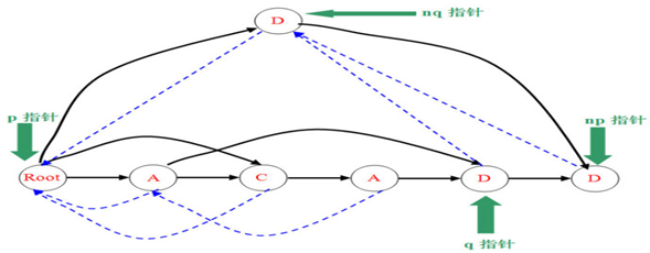 确定了是情况2,那么就要建立nq节点,图中可以很好的体现nq代替q的大部分功能(节点q的指针给nq,nq的fail改为p,q和np的fail改为nq)。