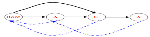 操作后新插入的new A节点的fail就是root的儿子节点A(第一个),那第一个A就有了两个身份,1是后缀A的末尾字符,2是后缀ACA的末尾字符(代替了new A,保证状态最简,root就不用和new A相连)。