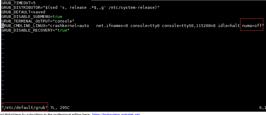 1. 编辑 /etc/default/grub 文件,如下图所示加上:numa=off