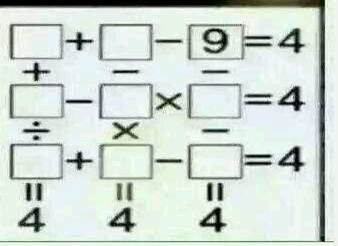 1 #include <iostream> 2 using namespace std; 3 4 void main() 5 { 6 int a,b,c,d,e,f,g,h; 7 for (a=0;a<=4;a++) 8 { 9 b=13-a; 10 for (e=0;e<=5;e++) 11 { 12 h=5-e; 13 14 for (d=1;d<=9;d++) 15 { 16 c=d*e+4; 17 for (g=1;g<=9;g++) 18 { 19 20 for (f=1;f<=100;f++) 21 { 22 if (c%f == 0) 23 { 24 if ((a+c/f == 4)&&(b-d*g == 4)&&(f+g-h == 4)) 25 { 26 cout << a << " "<< b <<" "<<9<<endl; 27 cout << c << " "<< d <<" "<<e<<endl; 28 cout << f << " "<< g <<" "<<h<<endl; 29 30 } 31 } 32 else 33 continue; 34 35 } 36 } 37 } 38 39 } 40 } 41 42 }