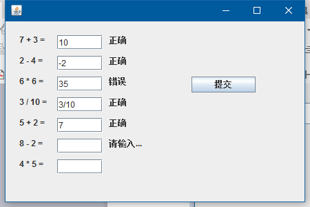 1 JTextField answer_text = new JTextField(); 2 answer_text.addFocusListener(new FocusListener(){ 3 public void actionPerformed(FocusListener e) { 4 5 } 6 7 @Override 8 public void focusGained(FocusEvent e) { 9 // TODO Auto-generated method stub 10 result_label.setText("请输入答案"); 11 } 12 13 @Override 14 public void focusLost(FocusEvent e) { 15 // TODO Auto-generated method stub 16 answer = answer_text.getText(); 17 int i= (answer_text.getY()-20)/30; 18 if (answer_text.getText().equals(ans)) { 19 result_label.setText("正确"); 20 21 gener.getYourAnswers()[i] = "right"; 22 } 23 else{ 24 result_label.setText("错误"); 25 26 gener.getYourAnswers()[i] = "你做错了"; 27 } 28 if (i == N) { 29 //停止时间 30 } 31 32 } 33 } 34 );