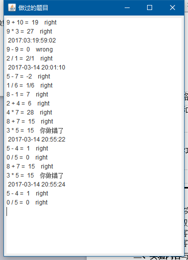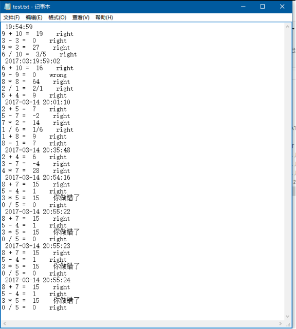 - 记录用户的对错总数,程序退出再启动的时候,能把以前的对错数量保存并在此基础上增量计算。