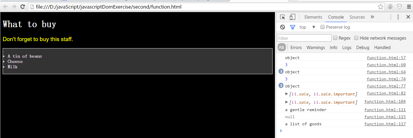 <!DOCTYPE html> <html> <head lang="en"> <meta charset="utf-8" /> <title> 5 DOM Function</title> <style type="text/css"> body{ color:white; background-color: black; } p{ color: yellow; font-family: "arial", sans-serif; font-size: 1.2em; } #purchases{ border:1px solid white; background-color: #333; color:#ccc; padding: 1em; } /* Although id can only be used once, it can also set CSS for other elements which are included in particulur element */ #purchases li{ font-weight: bold; } </style> </head> <body> <!-- A simple example --> <h1> What to buy </h1> <p title="a gentle reminder"> Don't forget to buy this staff. </p> <ul id="purchases"> <li> A tin of beans </li> <li class="sale"> Cheese </li> <li class="sale important"> Milk </li> </ul> <!-- getElementById, getElementByTagName, getElementsByClassName, getAttribute, setAttribute --> <script type="text/javascript"> /* Let's explain what is the DOM's meaning: D : means document; O : means objects, there are three types of objects in javascript==> user-defined object: the object created by your ownself; native object: thw object created by javascript itself, like Array, Math, Date and so on; host object: the object provided by web browser, the basic object of host object is window object. And the properties & functions of window object are called "BOM" which I think call it "WOM" is more suitable. BOM provides window.blur & window.open functions. M : means "Model" or "Map" that standards the forms of some things. */ /* node : a connection point in the network. The document is made up of nodes. It includes three types => element node; text node; attribute node. element node : the html's tags, like <html> <body> and so on; text node : just like the contents of <p> =>"XXXXXXX", it is often included in element node, but not every element node has text node; attribute node : description of elements, like almost every element node has an attribute node "title", for example, <p> has title="a gentle reminder". */ /* obtain elements : there are three functions can obtain element nodes => via id, tag name, class name;*/ console.log(typeof document.getElementById("purchases")); /* It will show "object" in browser */ console.log(document.getElementsByTagName("li").length); /* this function returns an array, and every element in this array is an object. You can try follows to verify: */ for(var i = 0;i < document.getElementsByTagName("li").length;i++) { console.log(typeof document.getElementsByTagName("li")[i]); } /* The most important thing is to be careful the function's spelling . If you want to know how many nodes in a document, you can use this : console.log(document.getElementsByTagName("*").length); you can also combine getElementsByTagName and getElementById,like follows: you will know how many lists the id "purchses" includes. */ var shopping = document.getElementById("purchases"); var items = shopping.getElementsByTagName("*"); console.log(items.length); for(var i = 0;i < items.length;i++) { console.log(typeof items[i]); } /* getElementsByClassName: it also returns an array. */ var sales = shopping.getElementsByClassName("sale"); console.log(sales); function getElementsByClassName(node, classname){ if(node.getElementsByClassName) { //console.log("Yes!"); return node.getElementsByClassName(classname); }else{ var results = new Array(); var elems = node.getElementsByTagName("*"); for(var i = 0;i < elems.length;i++) { if(elems[i],className.indexOf(classname)!=-1) { results[results.length] = elems[i]; } } return results; } } var sales2 = getElementsByClassName(shopping, "sale"); console.log(sales2); /* getAttribute(): object.getAttribute(attribute); you can use this function to look for one particular object's attribute. */ var paras = document.getElementsByTagName("p"); for(var i = 0;i < paras.length;i++) { console.log(paras[i].getAttribute("title")); } /* setAttribute(): object.setAttribute(attribute, value); you can use this function to change or set object's attribute. */ console.log(shopping.getAttribute("title")); shopping.setAttribute("title", "a list of goods"); console.log(shopping.getAttribute("title")); /* It is noteworthy that making changes to the document via function setAttribute() makes no difference when you view source using browser's select "view source". It because of DOM's operating mode : static content will be first loaded, dynamic refresh again, and dynamic refresh does not affect the static content of documents. We can see this function is very wonderful clearly! */ </script> </body> </html>