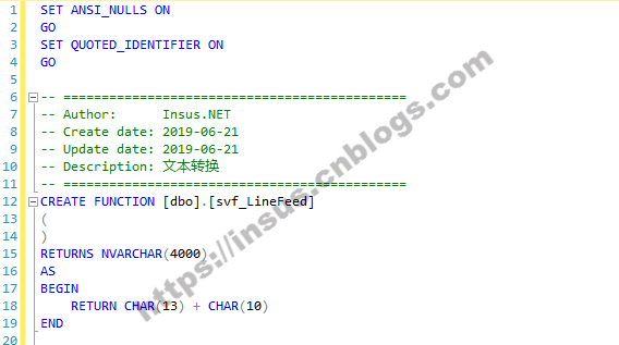 SET ANSI_NULLS ON GO SET QUOTED_IDENTIFIER ON GO -- ============================================= -- Author: Insus.NET -- Create date: 2019-06-21 -- Update date: 2019-06-21 -- Description: 文本转换 -- ============================================= CREATE FUNCTION [dbo].[svf_LineFeed] ( ) RETURNS NVARCHAR(4000) AS BEGIN RETURN CHAR(13) + CHAR(10) END