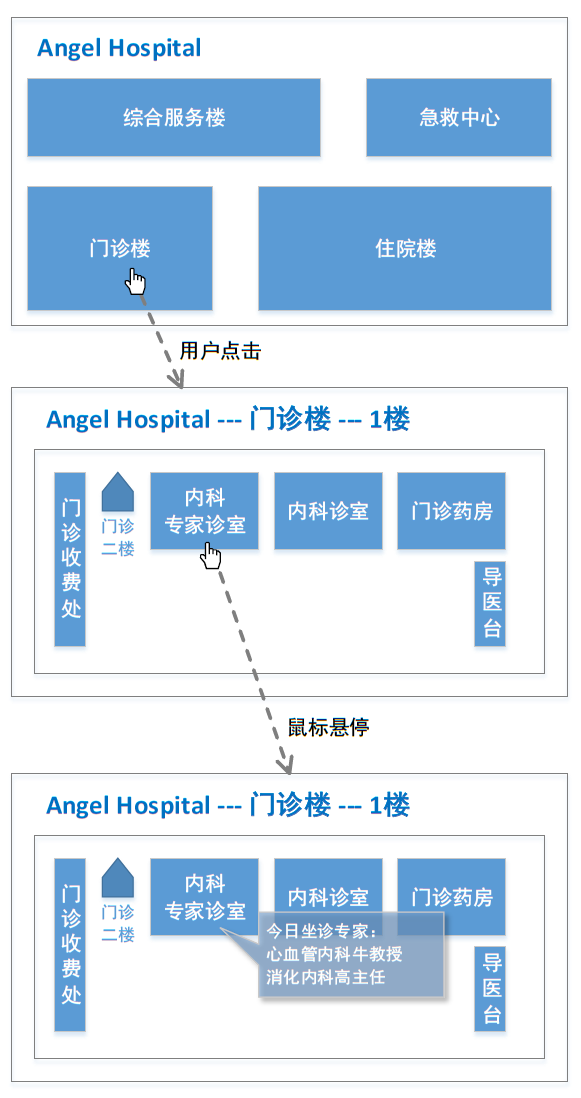 在页面上放置医院建筑物布局图,用户可以通过点击"逐层进入"获取自己需要的信息。如图所示: