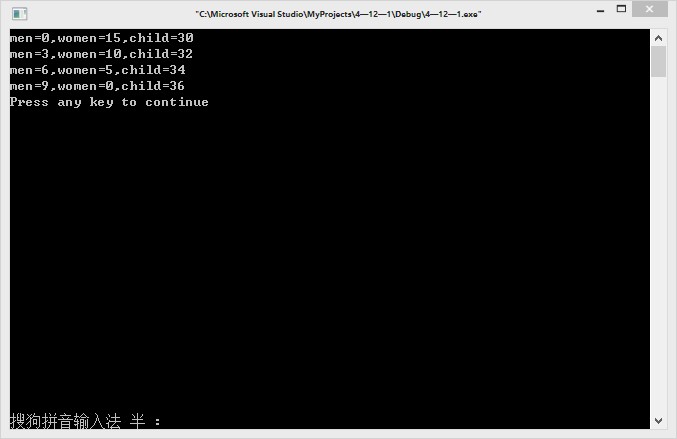 printf("men=%d,women=%d,child=%d\n",men,women,child);