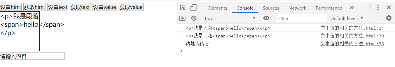 1 <!DOCTYPE html> 2 <html> 3 <head> 4 <title></title> 5 <style type="text/css"> 6 *{ 7 margin: 0; 8 padding: 0; 9 } 10 div{ 11 width: 100px; 12 height: 100px; 13 border: 1px solid black; 14 } 15 </style> 16 <script type="text/javascript" src="../js/jquery-1.12.4.js"></script> 17 <script type="text/javascript"> 18 $(function(){ 19 var btn = document.getElementsByTagName("button"); 20 btn[0].onclick = function(){ 21 $("div").html("<p>我是段落<span>hello</span></p>"); 22 } 23 btn[1].onclick = function(){ 24 console.log($("div").html()); 25 } 26 btn[2].onclick = function(){ 27 $("div").text("<p>我是段落<span>hello</span></p>"); 28 } 29 btn[3].onclick = function(){ 30 console.log($("div").text()); 31 } 32 btn[4].onclick = function(){ 33 $("input").val("请输入内容"); 34 } 35 btn[5].onclick = function(){ 36 console.log($("input").val()); 37 } 38 }); 39 </script> 40 </head> 41 <body> 42 <button>设置html</button> 43 <button>获取html</button> 44 <button>设置text</button> 45 <button>获取text</button> 46 <button>设置value</button> 47 <button>获取value</button> 48 <div></div> 49 <input type="" name=""> 50 </body> 51 </html>