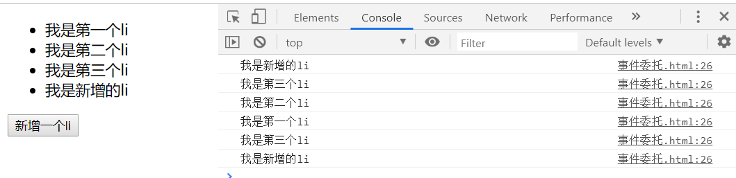 1 <!DOCTYPE html> 2 <html> 3 <head> 4 <title></title> 5 <script type="text/javascript" src="../js/jquery-1.12.4.js"></script> 6 <script type="text/javascript"> 7 $(function(){ 8 //什么是事件委托 9 //在入口函数之前不能自己完成的,要委托给别的来帮忙完成,比如li委托给父元素ul完成 10 11 $("button").click(function(){ 12 $("ul").append("<li>我是新增的li</li>"); 13 }); 14 15 //在JQ中,如果通过核心函数找到的元素不止一个,那么在添加事件的时候,JQ会遍历所有找到的元素,给所有找到的元素添加事件 16 17 //下面这个方法不能用在新增的li上,因为JQ是在页面加载完之后才执行入口函数 18 // $("ul>li").click(fucntion(){ 19 // console.log($(this).html()); 20 // }); 21 22 //下面代码的含义,让ul帮li监听click事件 23 //之所以能够监听,是因为入口函数执行的时候ul就已经存在了,所以能够添加事件 24 //之所以this是li,是因为我们点击的是li,而li没有click事件,所以事件冒泡传递给了ul,既然事件是从li传递过来的,所以ul必然指定this是谁 25 $("ul").delegate("li","click",function(){ 26 console.log($(this).html()); 27 }); 28 }); 29 </script> 30 </head> 31 <body> 32 <ul> 33 <li>我是第一个li</li> 34 <li>我是第二个li</li> 35 <li>我是第三个li</li> 36 </ul> 37 <button>新增一个li</button> 38 </body> 39 </html>
