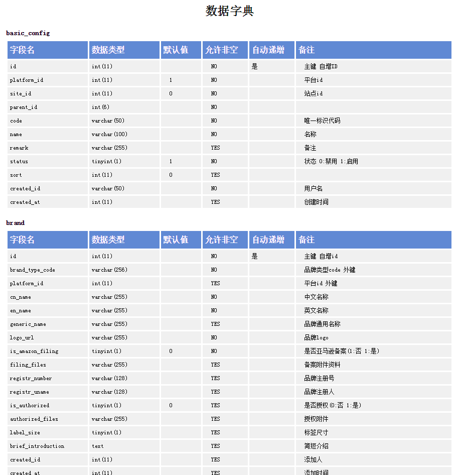 1 <?php 2 /** 3 * 生成mysql数据字典 4 */ 5 header ( "Content-type: text/html; charset=utf-8" ); 6 7 // 配置数据库 8 $dbserver = "localhost";//数据库IP地址 9 $dbusername = "root";//数据库用户名 10 $dbpassword = "";//数据库密码 11 $database = "test";//数据库名称 12 13 // 其他配置 14 $title = '数据字典'; 15 16 $mysql_conn = @mysql_connect ( "$dbserver", "$dbusername", "$dbpassword" ) or die ( "Mysql connect is error." ); 17 mysql_select_db ( $database, $mysql_conn ); 18 mysql_query ( 'SET NAMES utf8', $mysql_conn ); 19 $table_result = mysql_query ( 'show tables', $mysql_conn ); 20 // 取得所有的表名 21 while ( $row = mysql_fetch_array ( $table_result ) ) { 22 $tables [] ['TABLE_NAME'] = $row [0]; 23 } 24 25 // 循环取得所有表的备注及表中列消息 26 foreach ( $tables as $k => $v ) { 27 $sql = 'SELECT * FROM '; 28 $sql .= 'INFORMATION_SCHEMA.TABLES '; 29 $sql .= 'WHERE '; 30 $sql .= "table_name = '{$v['TABLE_NAME']}' AND table_schema = '{$database}'"; 31 $table_result = mysql_query ( $sql, $mysql_conn ); 32 while ( $t = mysql_fetch_array ( $table_result ) ) { 33 $tables [$k] ['TABLE_COMMENT'] = $t ['TABLE_COMMENT']; 34 } 35 36 $sql = 'SELECT * FROM '; 37 $sql .= 'INFORMATION_SCHEMA.COLUMNS '; 38 $sql .= 'WHERE '; 39 $sql .= "table_name = '{$v['TABLE_NAME']}' AND table_schema = '{$database}'"; 40 41 $fields = array (); 42 $field_result = mysql_query ( $sql, $mysql_conn ); 43 while ( $t = mysql_fetch_array ( $field_result ) ) { 44 $fields [] = $t; 45 } 46 $tables [$k] ['COLUMN'] = $fields; 47 } 48 mysql_close ( $mysql_conn ); 49 50 $html = ''; 51 // 循环所有表 52 foreach ( $tables as $k => $v ) { 53 // $html .= '<p><h2>'. $v['TABLE_COMMENT'] . ' </h2>'; 54 $html .= '<table border="1" cellspacing="0" cellpadding="0" align="center">'; 55 $html .= '<caption>' . $v ['TABLE_NAME'] . ' ' . $v ['TABLE_COMMENT'] . '</caption>'; 56 $html .= '<tbody><tr><th>字段名</th><th>数据类型</th><th>默认值</th> 57 <th>允许非空</th> 58 <th>自动递增</th><th>备注</th></tr>'; 59 $html .= ''; 60 61 foreach ( $v ['COLUMN'] as $f ) { 62 $html .= '<tr><td class="c1">' . $f ['COLUMN_NAME'] . '</td>'; 63 $html .= '<td class="c2">' . $f ['COLUMN_TYPE'] . '</td>'; 64 $html .= '<td class="c3"> ' . $f ['COLUMN_DEFAULT'] . '</td>'; 65 $html .= '<td class="c4"> ' . $f ['IS_NULLABLE'] . '</td>'; 66 $html .= '<td class="c5">' . ($f ['EXTRA'] == 'auto_increment' ? '是' : ' ') . '</td>'; 67 $html .= '<td class="c6"> ' . $f ['COLUMN_COMMENT'] . '</td>'; 68 $html .= '</tr>'; 69 } 70 $html .= '</tbody></table></p>'; 71 } 72 73 // 输出 74 echo '<html> 75 <head> 76 <meta http-equiv="Content-Type" content="text/html; charset=utf-8" /> 77 <title>' . $title . '</title> 78 <style> 79 body,td,th {font-family:"宋体"; font-size:12px;} 80 table{border-collapse:collapse;border:1px solid #CCC;background:#6089D4;} 81 table caption{text-align:left; background-color:#fff; line-height:2em; font-size:14px; font-weight:bold; } 82 table th{text-align:left; font-weight:bold;height:26px; line-height:25px; font-size:16px; border:3px solid #fff; color:#ffffff; padding:5px;} 83 table td{height:25px; font-size:12px; border:3px solid #fff; background-color:#f0f0f0; padding:5px;} 84 .c1{ width: 150px;} 85 .c2{ width: 130px;} 86 .c3{ width: 70px;} 87 .c4{ width: 80px;} 88 .c5{ width: 80px;} 89 .c6{ width: 300px;} 90 </style> 91 </head> 92 <body>'; 93 echo '<h1 style="text-align:center;">' . $title . '</h1>'; 94 echo $html; 95 echo '</body></html>'; 96 97 ?>