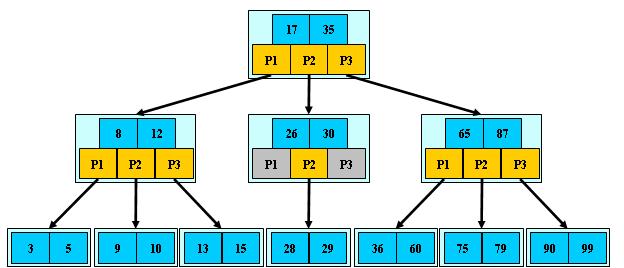 P[M]指向关键字大于K[M-1]的子树,其它P[i]指向关键字属于(K[i-1], K[i])的子树;