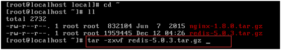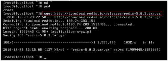 2.下载redis源码包到root目录: wget http://download.redis.io/releases/redis-5.0.3.tar.gz