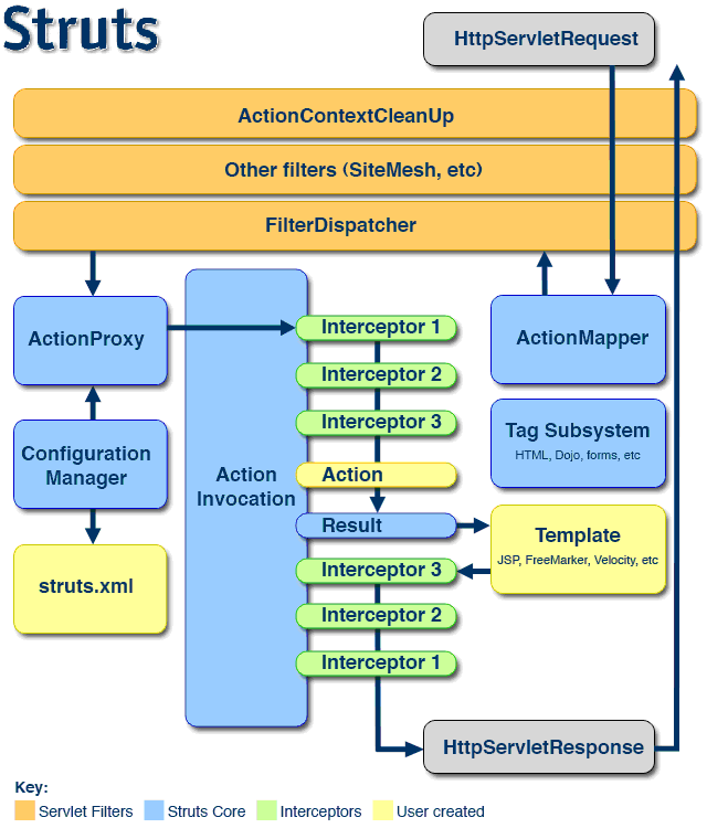 如:ConfigurationManager、ActionMapper和ObjectFactory。ConfigurationManager存有配置文件的一些基本信息,ActionMapper存有action的配置信息。在请求过程中所有的对象(Action,Results, Interceptors,等)都是通过ObjectFactory来创建的。