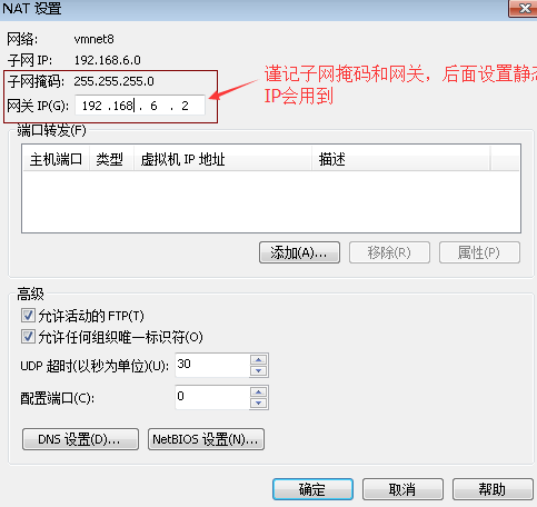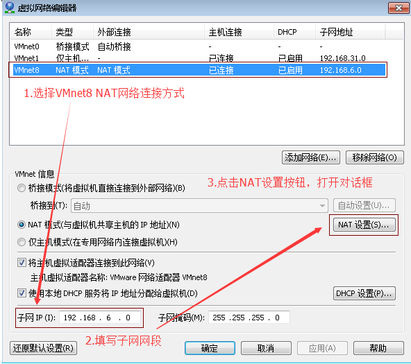 一、安装好虚拟后在菜单栏选择编辑→ 虚拟网络编辑器,打开虚拟网络编辑器对话框,选择Vmnet8 Net网络连接方式,随意设置子网IP,点击NAT设置页面,查看子网掩码和网关,后面修改静态IP会用到