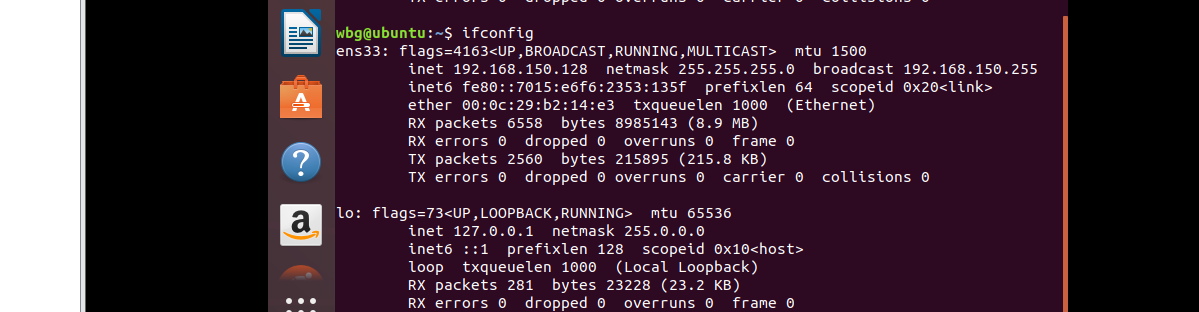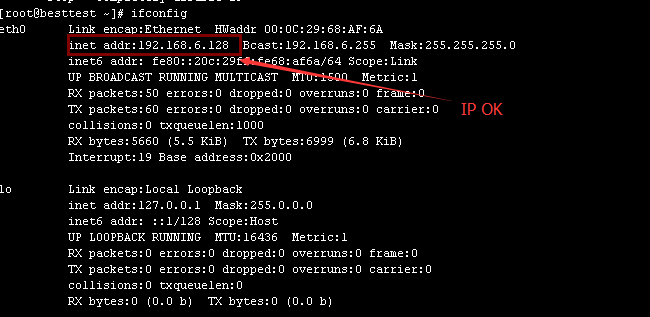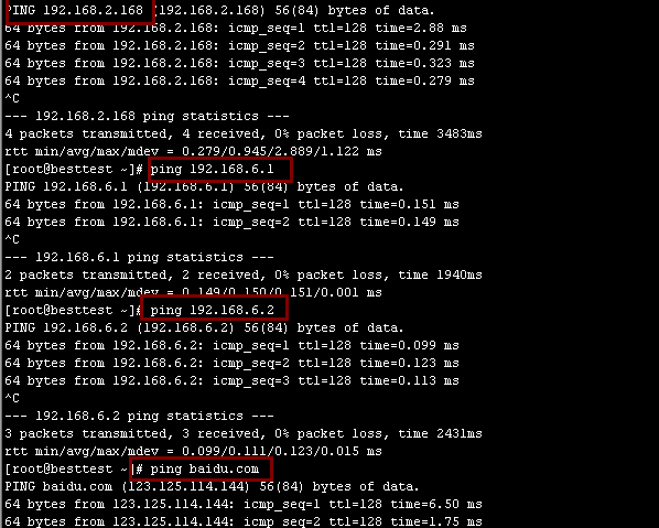IP(192.168.6.1)、宿主机与虚拟机之前的网关IP(192.168.6.2)、ping外网(baidu.com)都可以通则说明虚拟机固定IP设置成功。