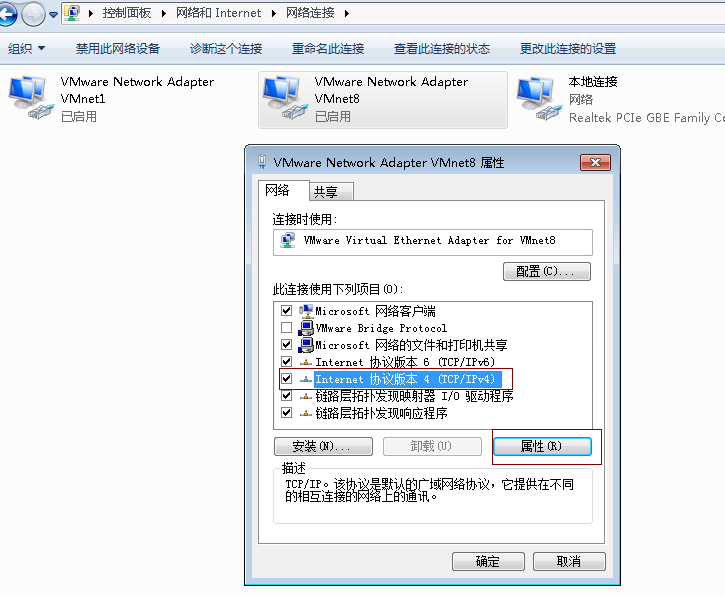 二、检查宿主机VM8 网卡设置,打开网络和共享中心→ 更改适配器设置→,在VMware Network Adapter VMnet8上单击右键,选择属性按钮打开属性对话框。