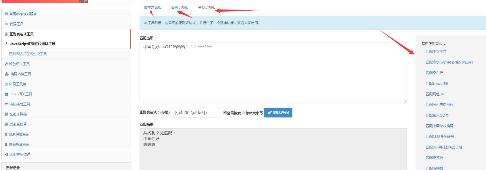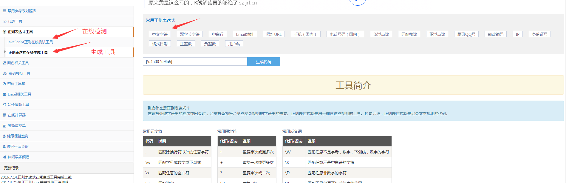 发现正则表达式在线生成或者检测工具非常强大,能够快速的匹配自己要书写的表达式,其中还列举了一些常用的表达式书写,不需要自己再一个一个去查找。