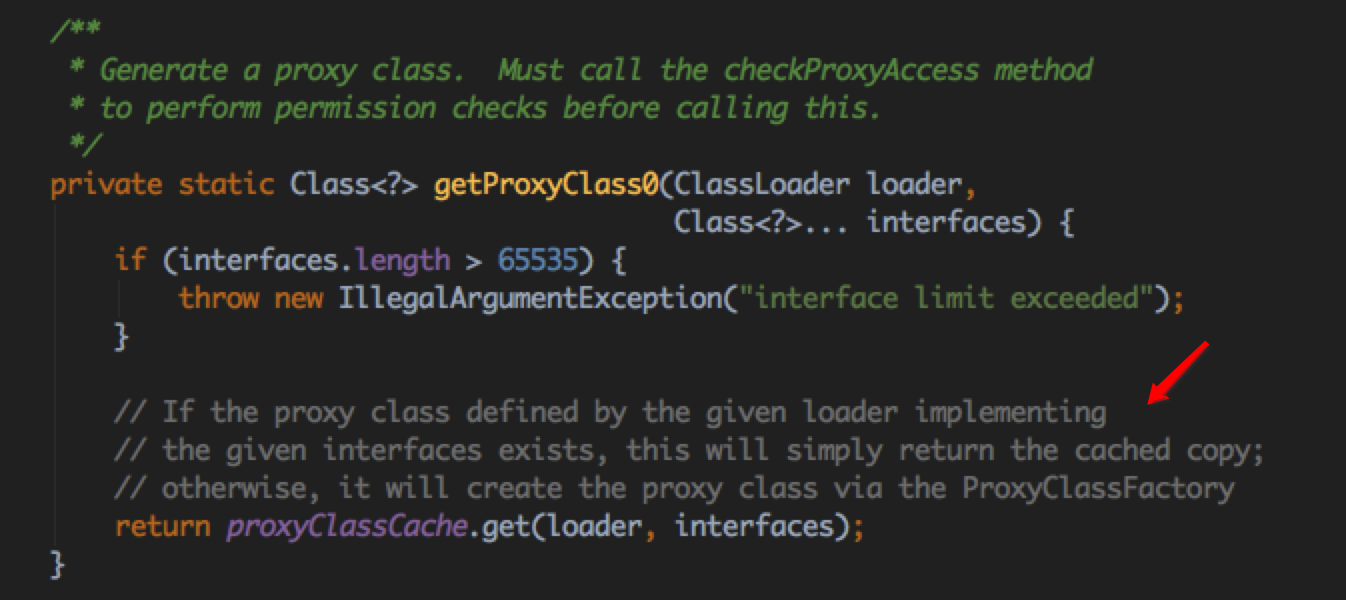 getProxyClass0() 方法首先是做了一些参数校验,之后从 proxyClassCache 参数中取出 Class 对象。其实 proxyClassCache 是一个 Map 对象,缓存了所有动态创建的 Class 对象。从源码中的注释可以知道,如果从 Map 中取出的对象为空,那么其会调用 ProxyClassFactory 生成对应的 Class 对象。