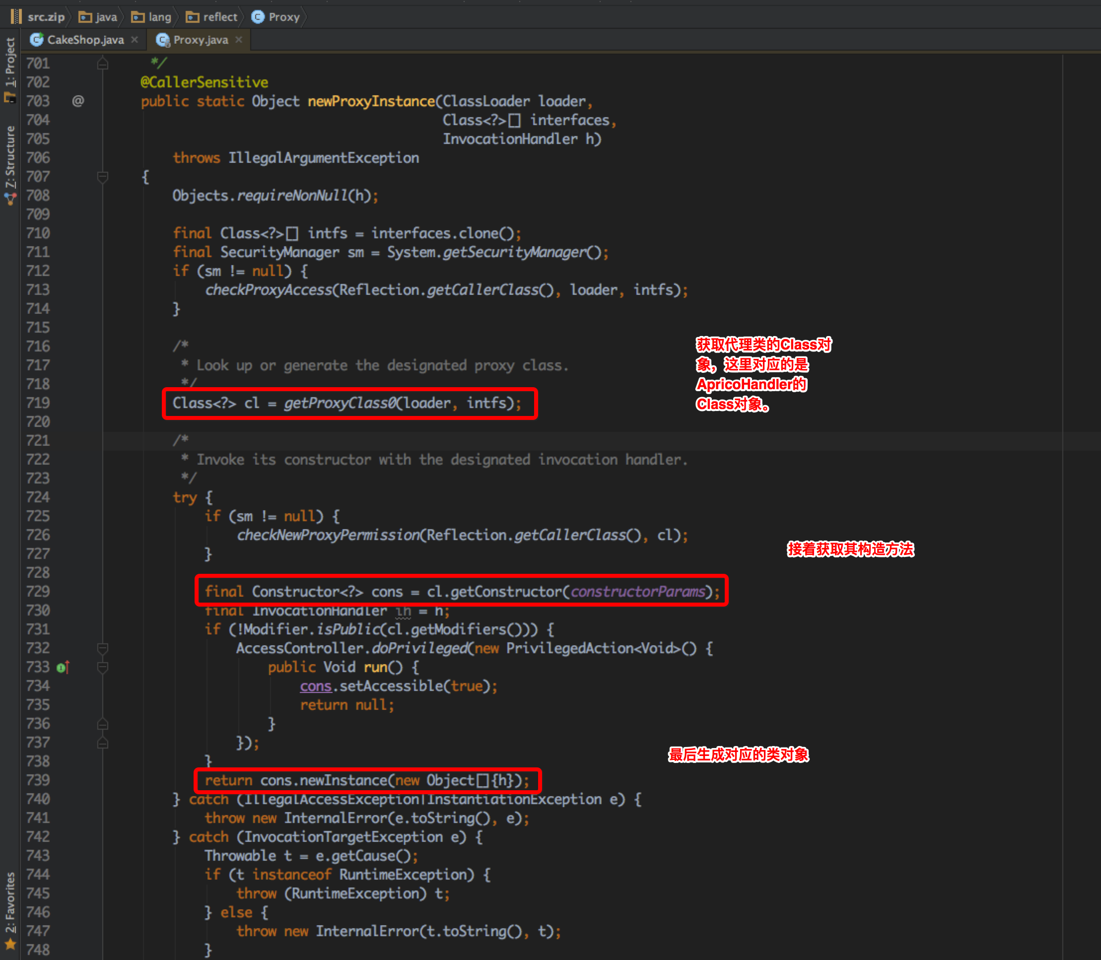 其实通过这个方法,Java 替我们生成了一个继承了指定接口(CakeMachine)的代理类(ApricotHandler)实例。从 Proxy.newInstance() 的源码我们可以看到首先调用了 getProxyClass0 方法,该方法返回了一个 Class 实例对象,该实例对象其实就是 ApricotHandler 的 Class 对象。接着获取其构造方法对象,最后生成该 Class 对象的实例。其实这里最主要的是 getProxyClass0() 方法,这里面动态生成了 ApricotHandler 的 Class 对象。下面我们就深入到 getProxyClass0() 方法中去了解这里面做了什么操作。