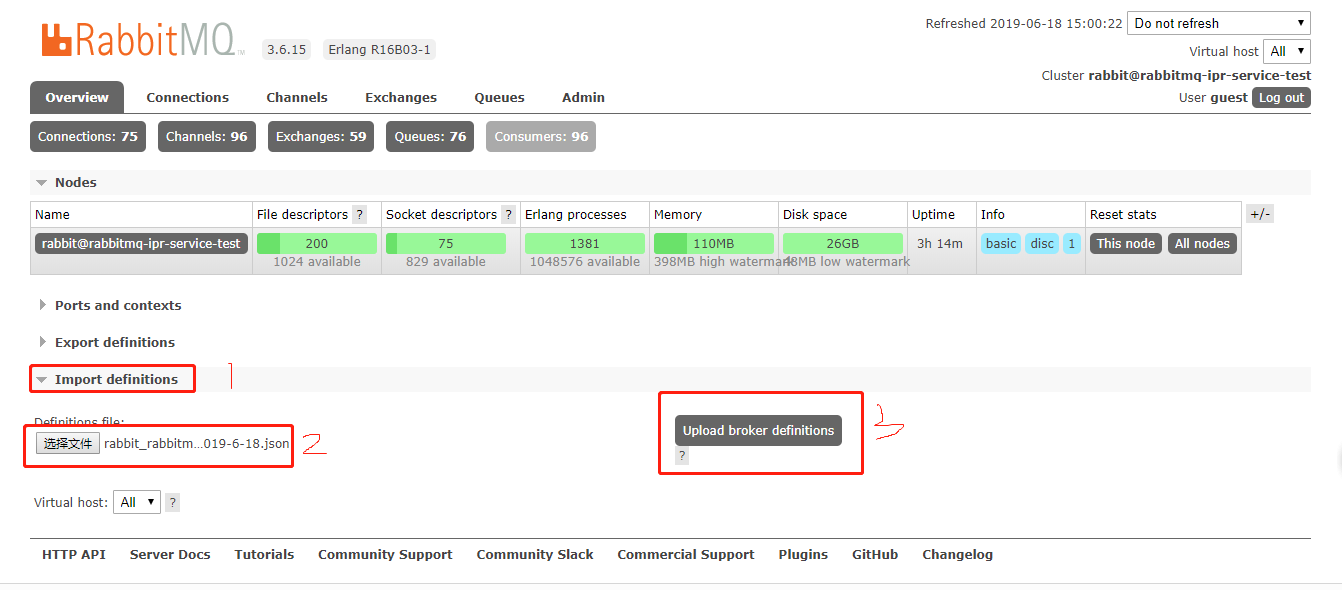 http://192.168.1.60:15672,进入如下图所示的位置,导入数据,大概10秒钟左右。