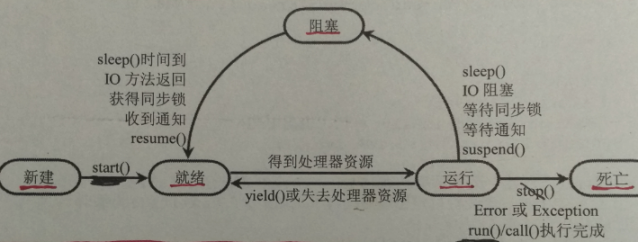 线程从创建、运行到结束总是处于下面五个状态之一:新建状态、就绪状态、运行状态、阻塞状态及死亡状态。