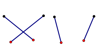 可以很容易的证明两条交叉边的距离和一定大于两条不交叉的距离和,因此问题转化为只要原图中存在交叉边,那么就可以找到更小的匹配的方式使得总距离更小。使用KM算法求出最小权值匹配输出匹配方案即可。