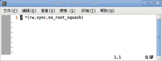 5.配置 NFS 服务;使用"vim /etc/exports"打开 NFS 的配置文件;按照如图 3-151进行修改。