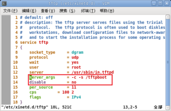 2.配置 tftp 服务器;使用命令"vim /etc/xinetd.d/tftp",对/etc/xinetd.d/tftp 文件进行如下图 3-148 修改;"server_args= -c -s /tftpboot"表示选择"/tftpboot"目录为 TFTP 服务器文件下载目录;"disabled=no"表示禁止不运行 TFTP 服务,即运行 TFTP 服务。
