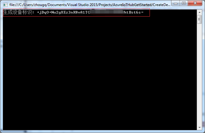 1 static void Main(string[] args) 2 { 3 var connectionString = "HostName=IoTTest.***-***;SharedAccessKeyName=iothubowner;SharedAccessKey=******"; 4 var registryManager = RegistryManager.CreateFromConnectionString(connectionString); 5 AddOrGetDeviceAsync().Wait(); 6 Console.ReadLine(); 7 }