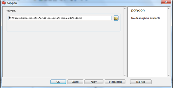 在这之前,我们需要在Geodatabase文件中新建一个Feature Class,其中类型选择Polygon Feature。为什么要建立这个呢?因为我们需要将这个模板引入到这个参数中,让Desktop知道我们要输入的是点、线还是面之类的。