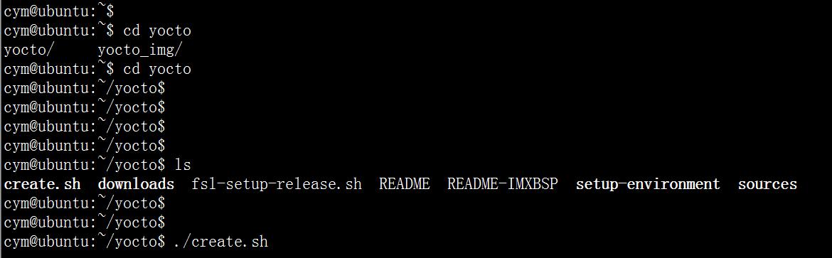 进入步骤三解压出来的Yocto源码文件夹,执行:./create.sh 命令,开始编译yocto,如下图:(编译时间大概会有10个小时,跟机器的配置有关)