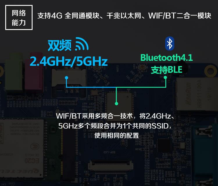 WIFI/BT:双频2.4G/5G WIFI、Bluetooth4.1二合一模块