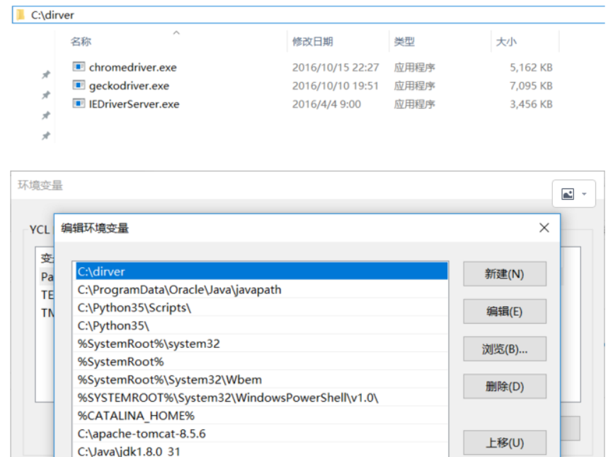 4.谷歌、IE等浏览器驱动(driver)下载地址:http://www.seleniumhq.org/download/,下载完了放到同一个文件夹,把此文件夹的路径加到path环境变量就可以了以win为例如下图: