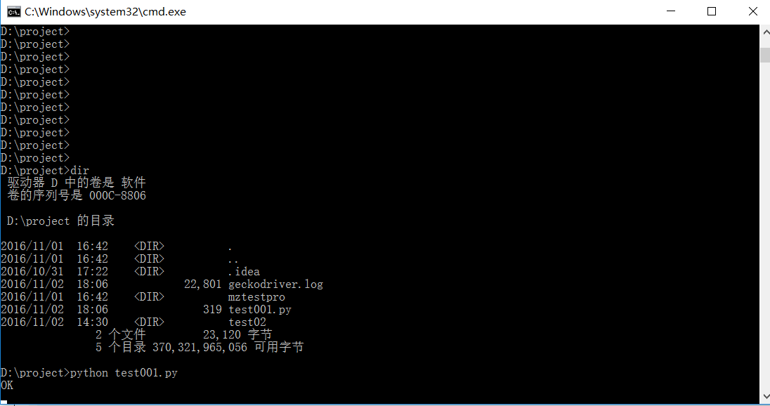 在cmd命令窗口切换到test001.py脚本文件的目录下执行命令:python test001.py