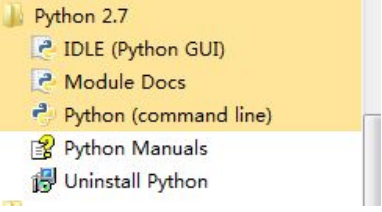 下载最新版本的 Python2,安装过程与其它 Windows 程序一样,安装完成在开始菜单中将看到安装好的 Python 目录: