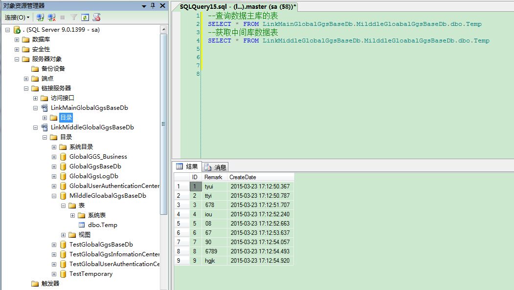 --查询数据主库的表 SELECT * FROM LinkMainGlobalGgsBaseDb.MilddleGloabalGgsBaseDb.dbo.Temp --获取中间库数据表 SELECT * FROM LinkMiddleGlobalGgsBaseDb.MilddleGloabalGgsBaseDb.dbo.Temp