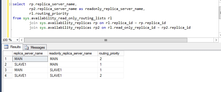 select rp.replica_server_name, rp2.replica_server_name as readonly_replica_server_name, rl.routing_priority from sys.availability_read_only_routing_lists rl join sys.availability_replicas rp on rl.replica_id = rp.replica_id join sys.availability_replicas rp2 on rl.read_only_replica_id = rp2.replica_id
