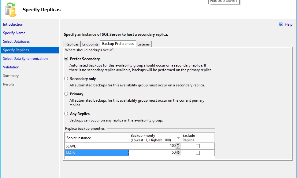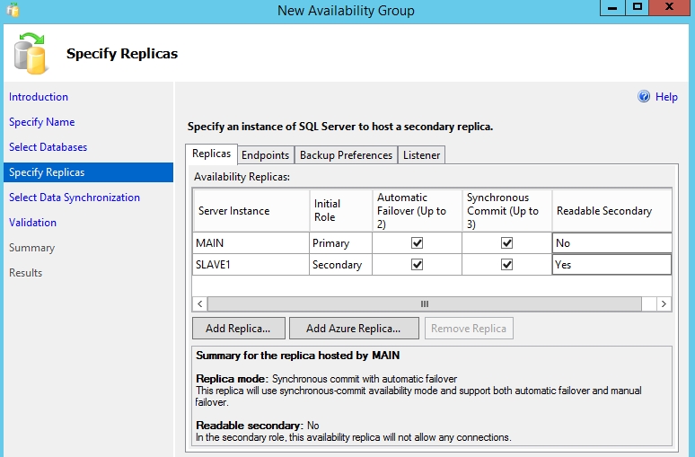 把Slave1添加进来作为辅助副本。勾选Synchronous Commit(同步提交),Up to 3的意思是最多可以有3个的同步提交模式的辅助副本。