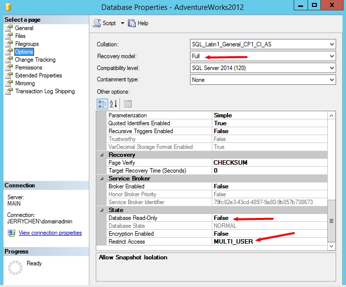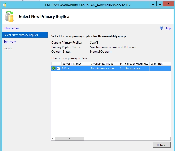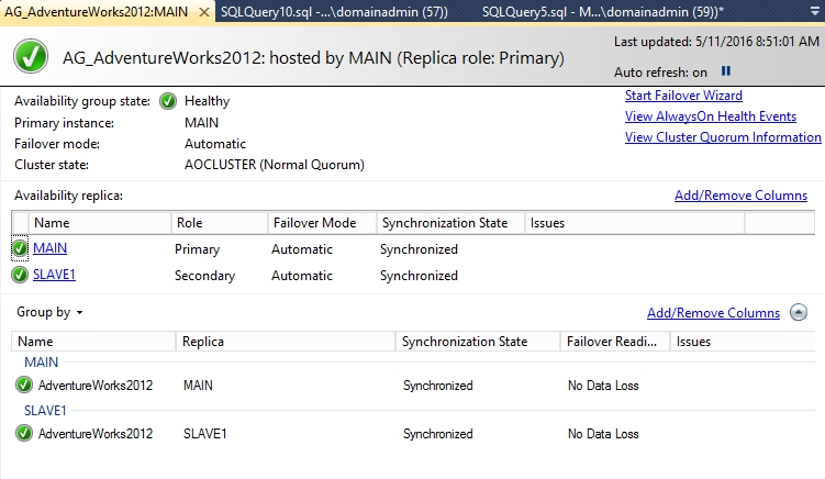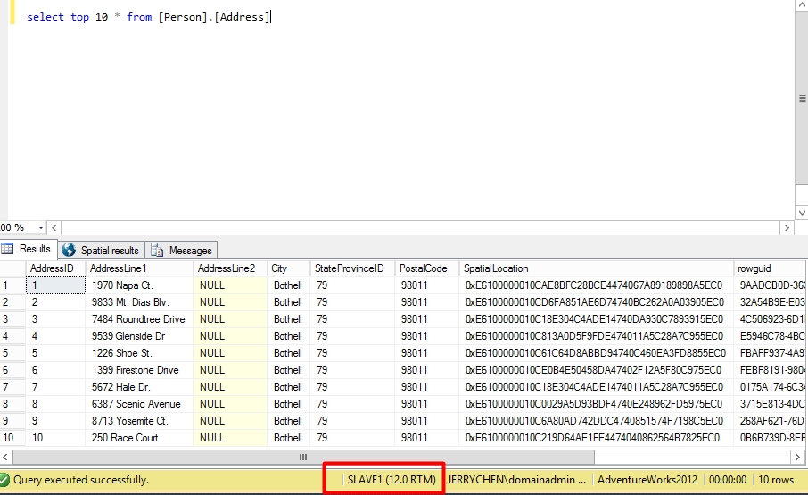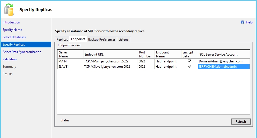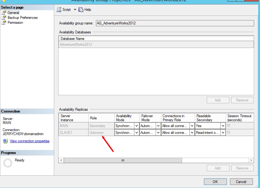 ALTER AVAILABILITY GROUP [AG_AdventureWorks2012] MODIFY REPLICA ON N'MAIN' WITH (SECONDARY_ROLE (ALLOW_CONNECTIONS = ALL)); ALTER AVAILABILITY GROUP [AG_AdventureWorks2012] MODIFY REPLICA ON N'MAIN' WITH (SECONDARY_ROLE (READ_ONLY_ROUTING_URL = N'TCP://MAIN.jerrychen.com:1433')); ALTER AVAILABILITY GROUP [AG_AdventureWorks2012] MODIFY REPLICA ON N'SLAVE1' WITH (SECONDARY_ROLE (ALLOW_CONNECTIONS = READ_ONLY)); ALTER AVAILABILITY GROUP [AG_AdventureWorks2012] MODIFY REPLICA ON N'SLAVE1' WITH (SECONDARY_ROLE (READ_ONLY_ROUTING_URL = N'TCP://SLAVE1.jerrychen.com:1433')); ALTER AVAILABILITY GROUP [AG_AdventureWorks2012] MODIFY REPLICA ON N'MAIN' WITH (PRIMARY_ROLE (READ_ONLY_ROUTING_LIST=('SLAVE1','MAIN'))); ALTER AVAILABILITY GROUP [AG_AdventureWorks2012] MODIFY REPLICA ON N'SLAVE1' WITH (PRIMARY_ROLE (READ_ONLY_ROUTING_LIST=('MAIN','SLAVE1'))); GO